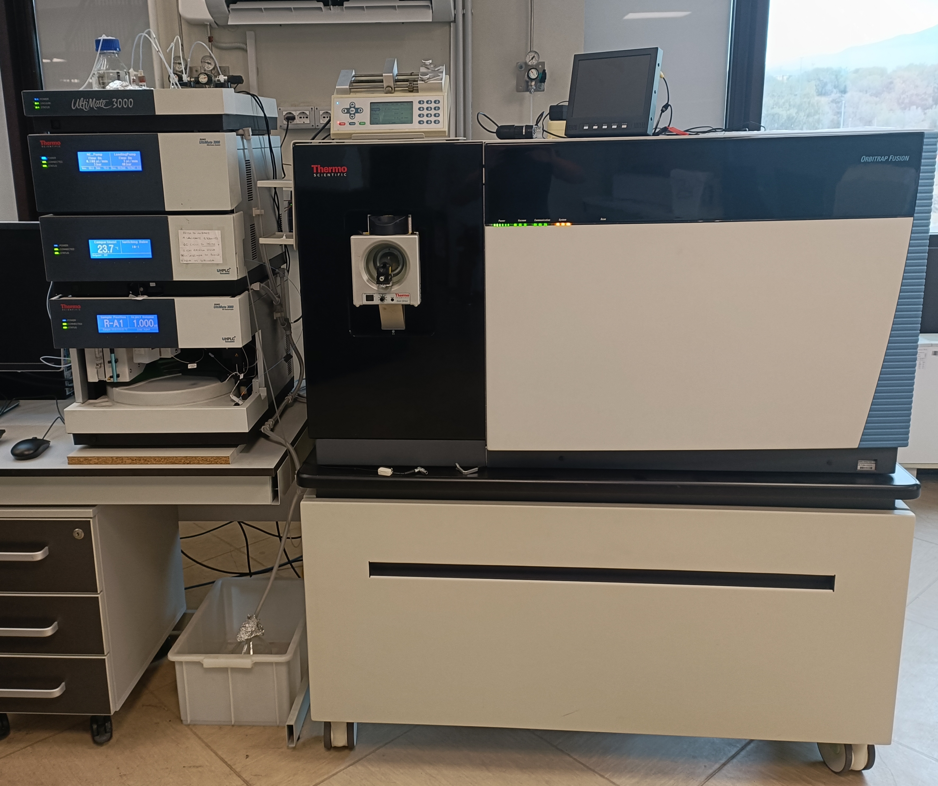 UHPLC–ESI–MS/MS system designed for proteomic applications, combining a Thermo Scientific™ Dionex™ UltiMate™ 3000 RSLCnano UHPLC (nano/capillary flow) with an Orbitrap Fusion™ Tribrid™ mass spectrometer. The RSLCnano pump provides nano/capillary flow rates from 20 nL/min up to 50 µL/min. The mass analyzer features a Tribrid™ architecture combining a quadrupole mass filter, a dual-pressure linear ion trap and an ultra-high-field Orbitrap™ mass analyzer.